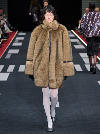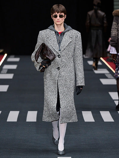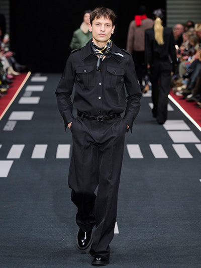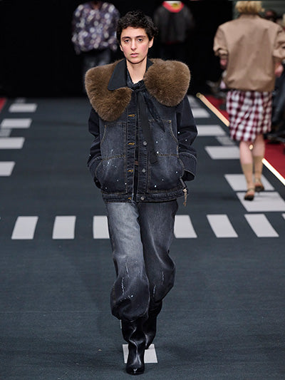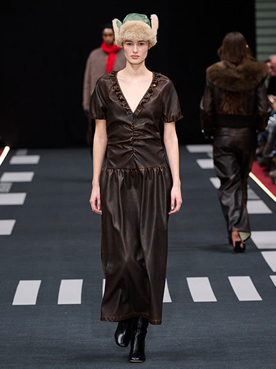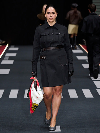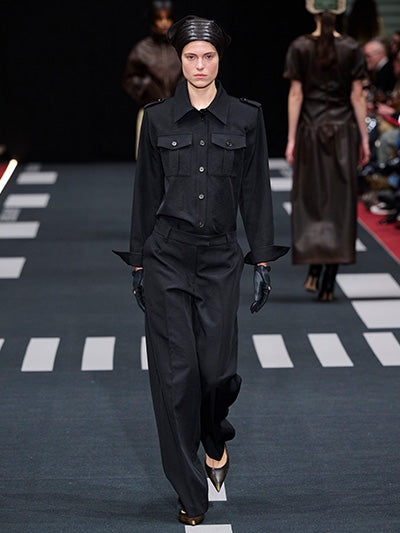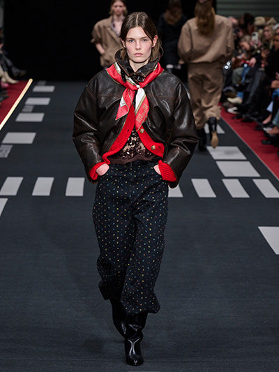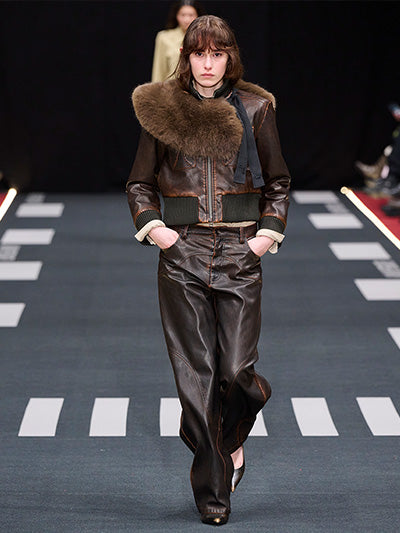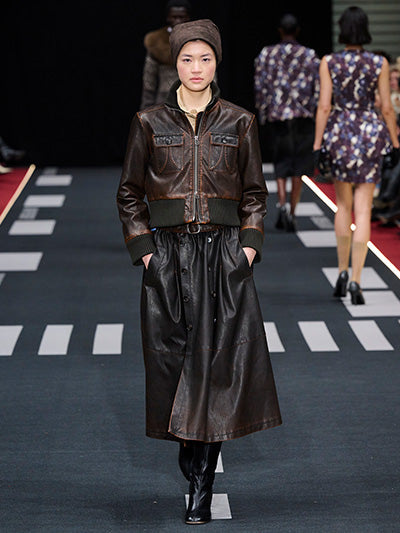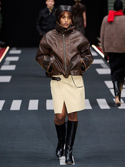 Airborne interprets rigid silhouettes through a softened, expressive lens. Aviator-inspired jackets, uniform shirts, distressed leather, and rigid denim form the backbone of the wardrobe. Outerwear plays a central role - puffed jackets, structured coats, and oversized aviator silhouettes dominate, evoking protection, strength, and adventure. These utilitarian foundations are offset by fluid dresses, lace trims, scarf-inspired details, and lightweight fabrics that introduce movement and delicacy.